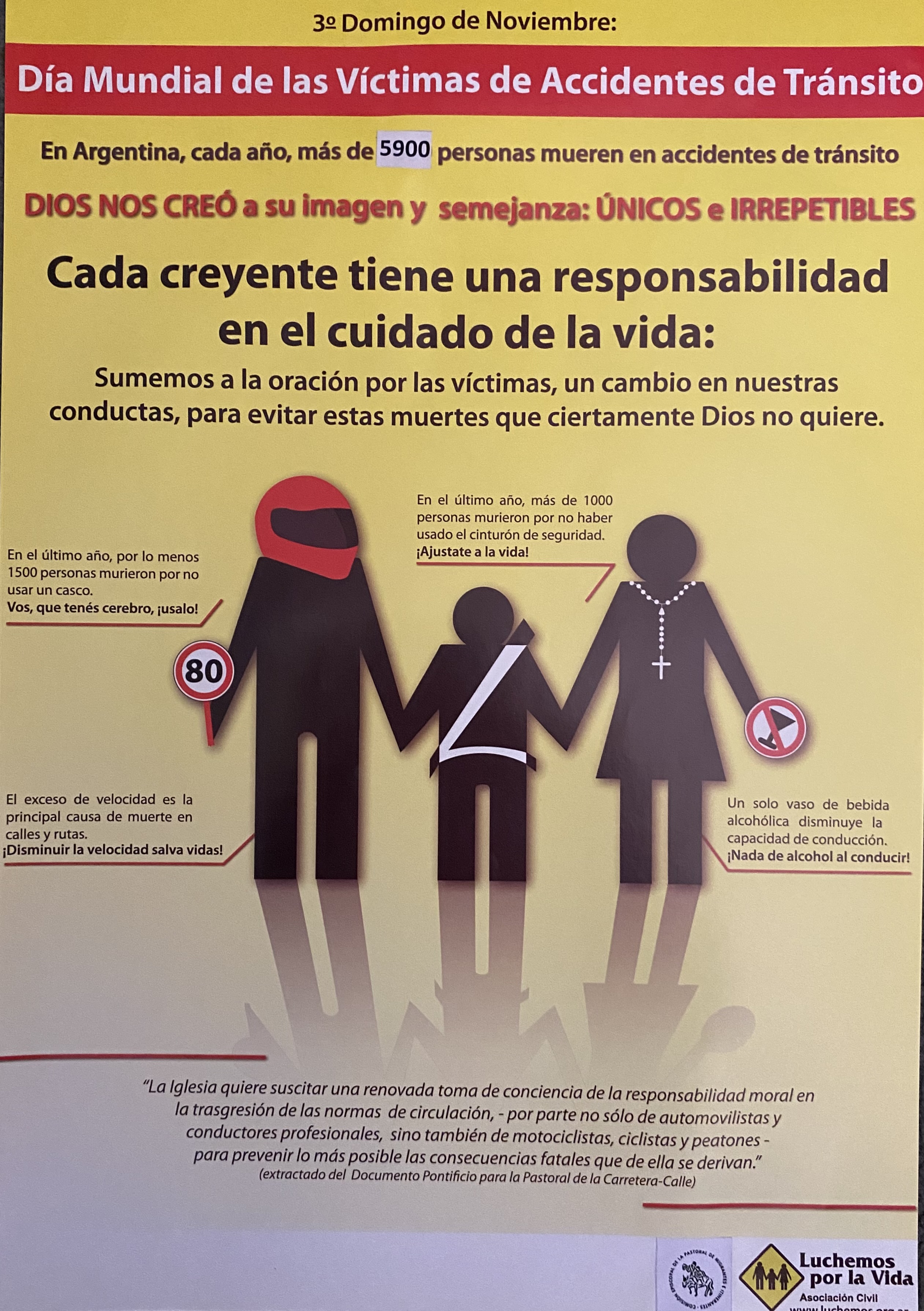 - Se distribuyeron 300 afiches en parroquias de la Ciudad de Buenos Aires, y se entregaron a los Obispos presentes en la reciente Reunión de la Conferencia Episcopal Argentina para distribuir a parroquias de todo el país, solicitándole a cada Obispo y Sacerdote decir unas palabras en las celebraciones, no solo en memoria de las víctimas, sino también sobre la responsabilidad de los creyentes en la conducción segura para el cuidado de la vida. Como respuesta a este pedido, muchos de ellos dedicaron un tiempo durante la homilía a este tema.