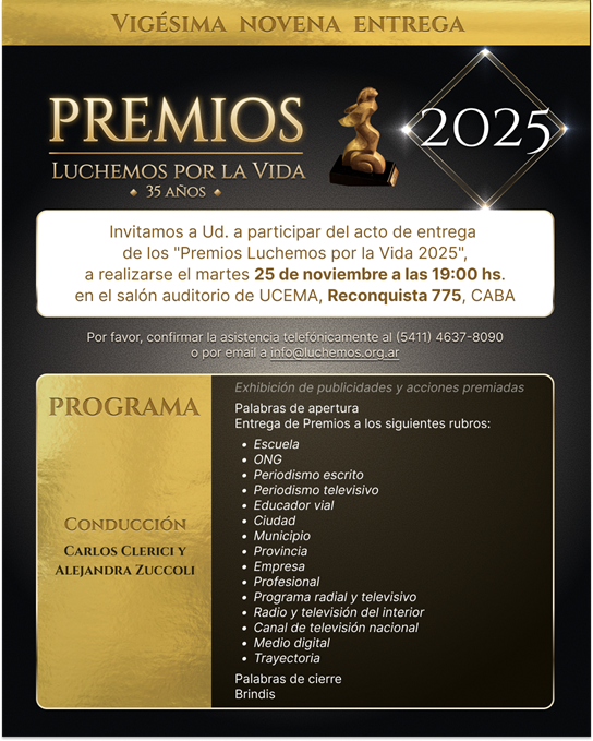 Luchemos por la Vida ha cumplido 35 años de lucha por la Vida y lo celebrará en esta nueva entrega de los Premios Luchemos por la Vida 2025, que tendrá lugar el próximo martes 25 de noviembre a las 19 hs., en la sede de la Universidad del CEMA.